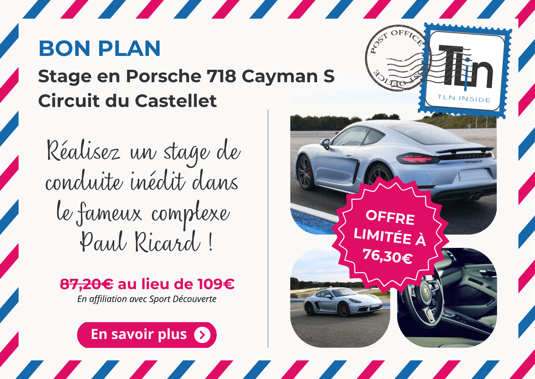 ⚡ Offre éclair -30% ⚡ Pilotez une Porsche sur un circuit mythique.Installez-vous au volant de la Porsche 718 Cayman S et pilotez sur le circuit du Castellet ! Offre spéciale à 76,30€ au lieu de 109€