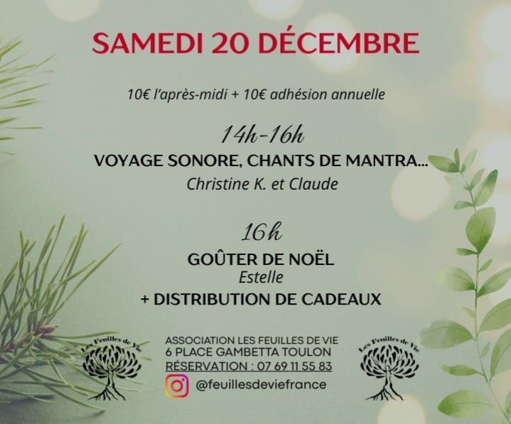 Voyage sonore et Goûter de Noël🎶✨ Voyage sonore, chants de Mantras & goûter de Noël 🎄 📍 Association Les Feuilles de Vie – samedi 20 décembre à Toulon 🎁