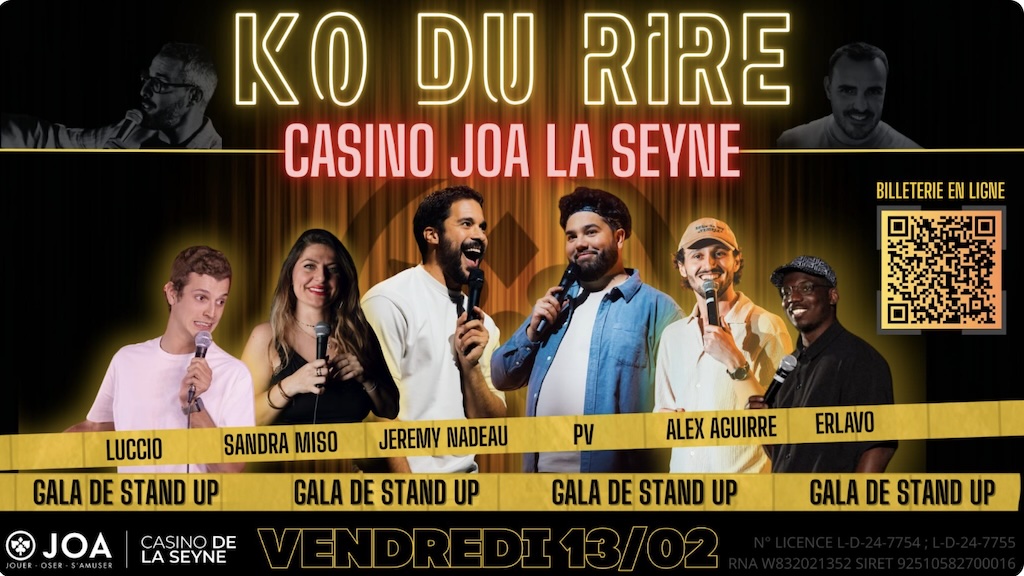 Soirée de Gala K.O DU RIREVenez vivre avec nous la 2ème soirée de Gala de K.O du Rire au Casino JOA de La Seyne ce vendredi 13 février 2026 à 20h30 !
